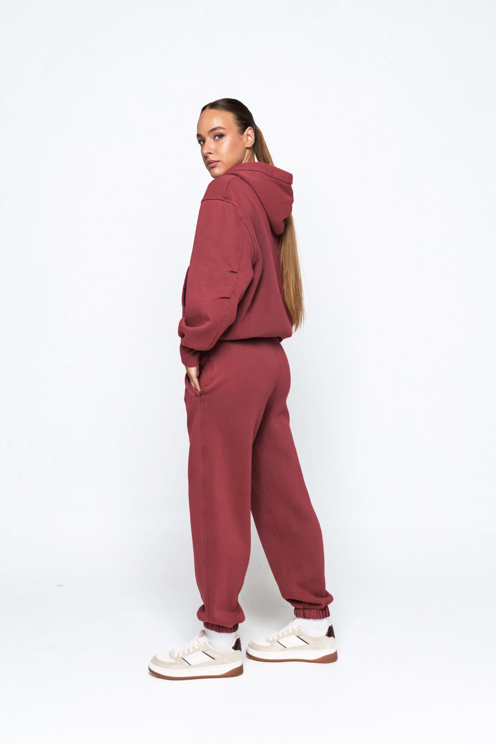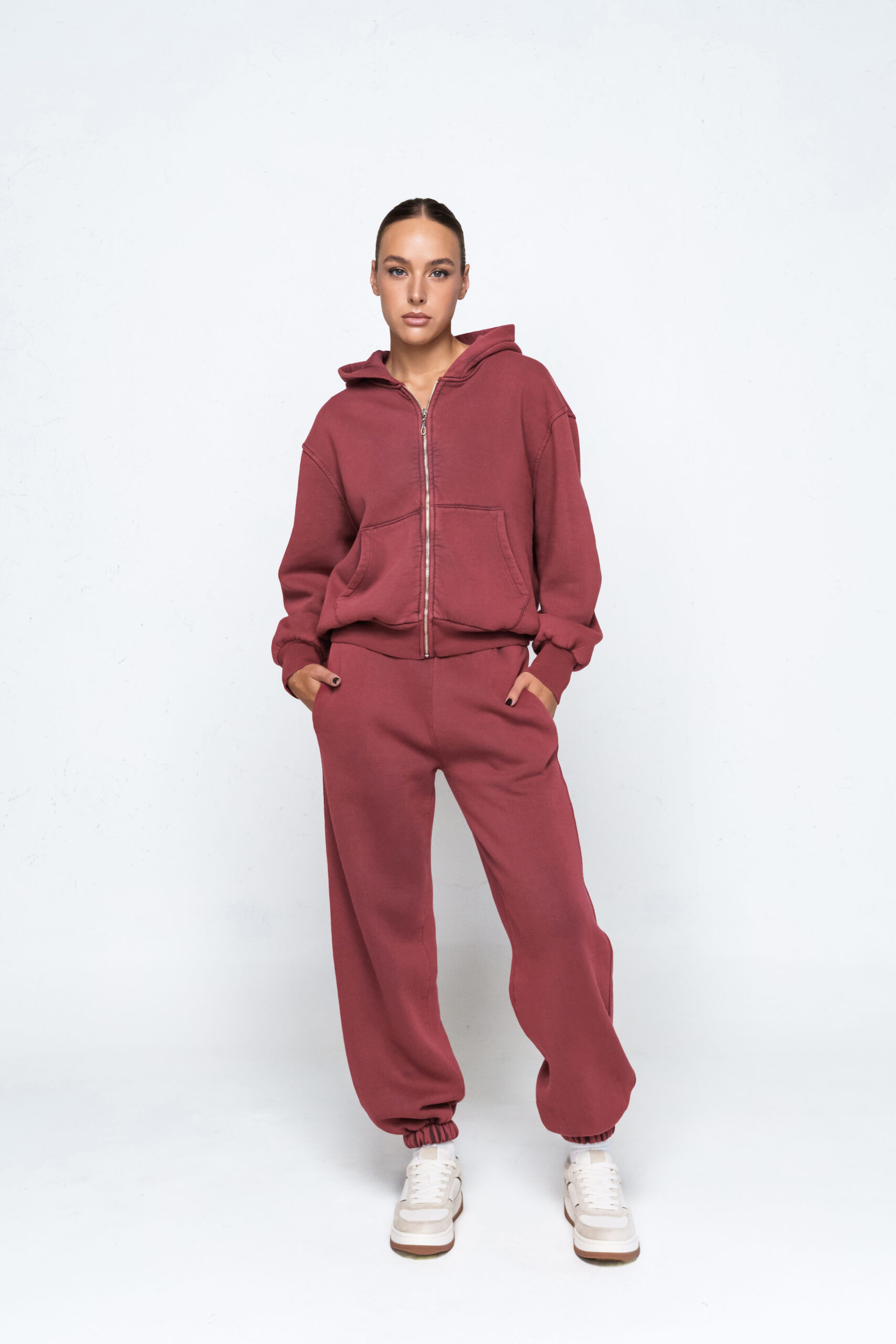 Šis kostiumėlis pagamintas iš 100% medvilnės ir išsiskiria unikaliu blukinimo akmenimis procesu. Dėl jo viduje esantis flisas įgavo šiek tiek susiburbuliavusią tekstūrą – tai natūralus gamybos rezultatas, suteikiantis audiniui ypatingo minkštumo ir jaukumo. Medžiaga vidutinio storumo, todėl puikiai tinka tiek rudens, tiek vėsesnėms žiemos dienoms.