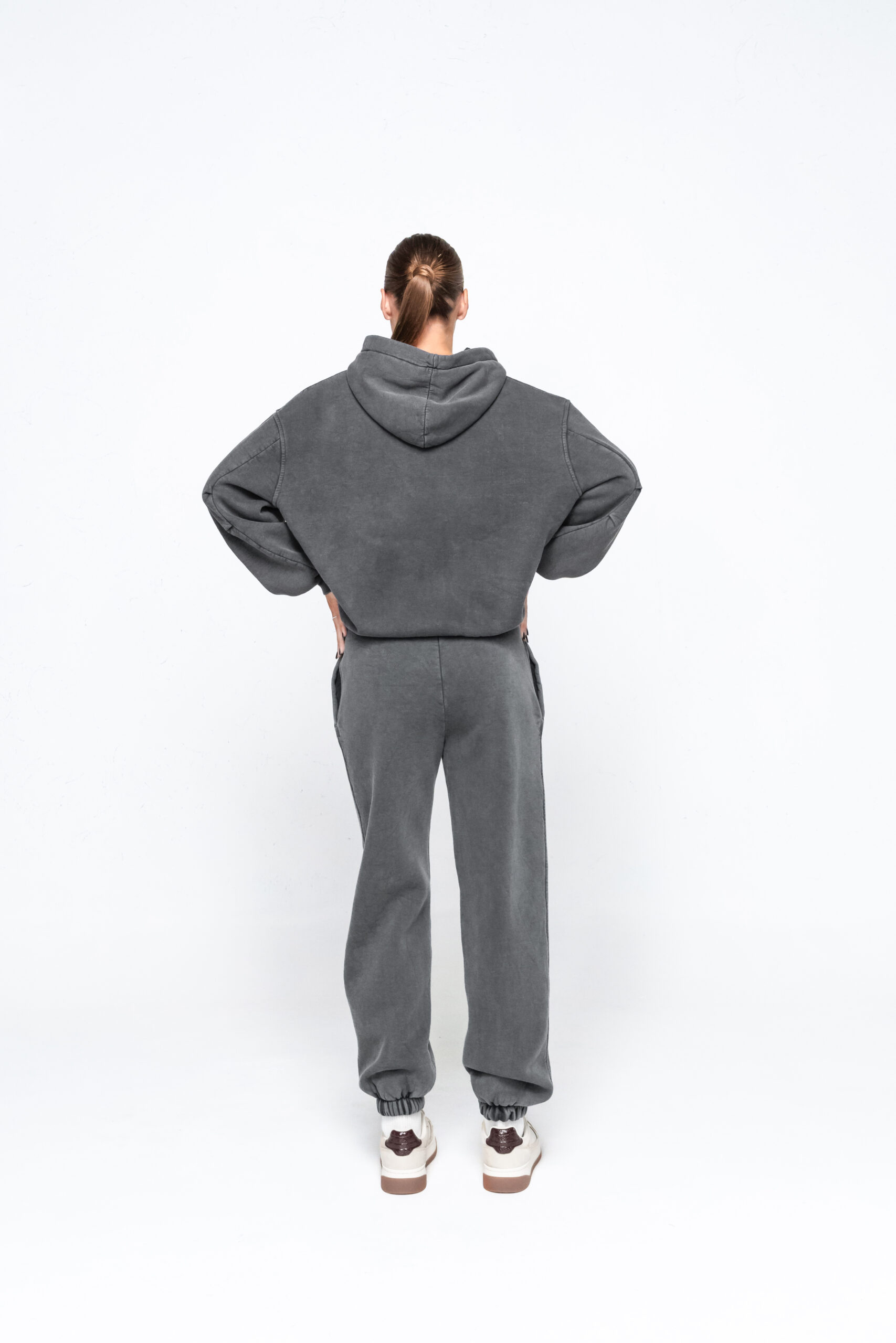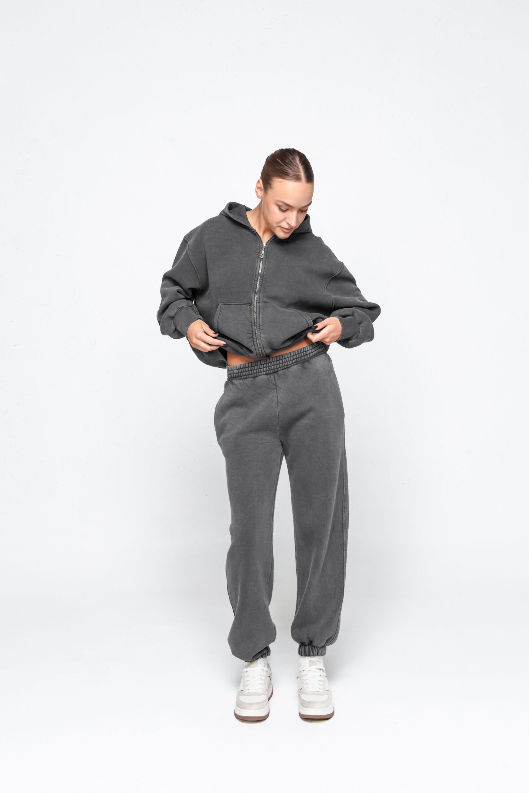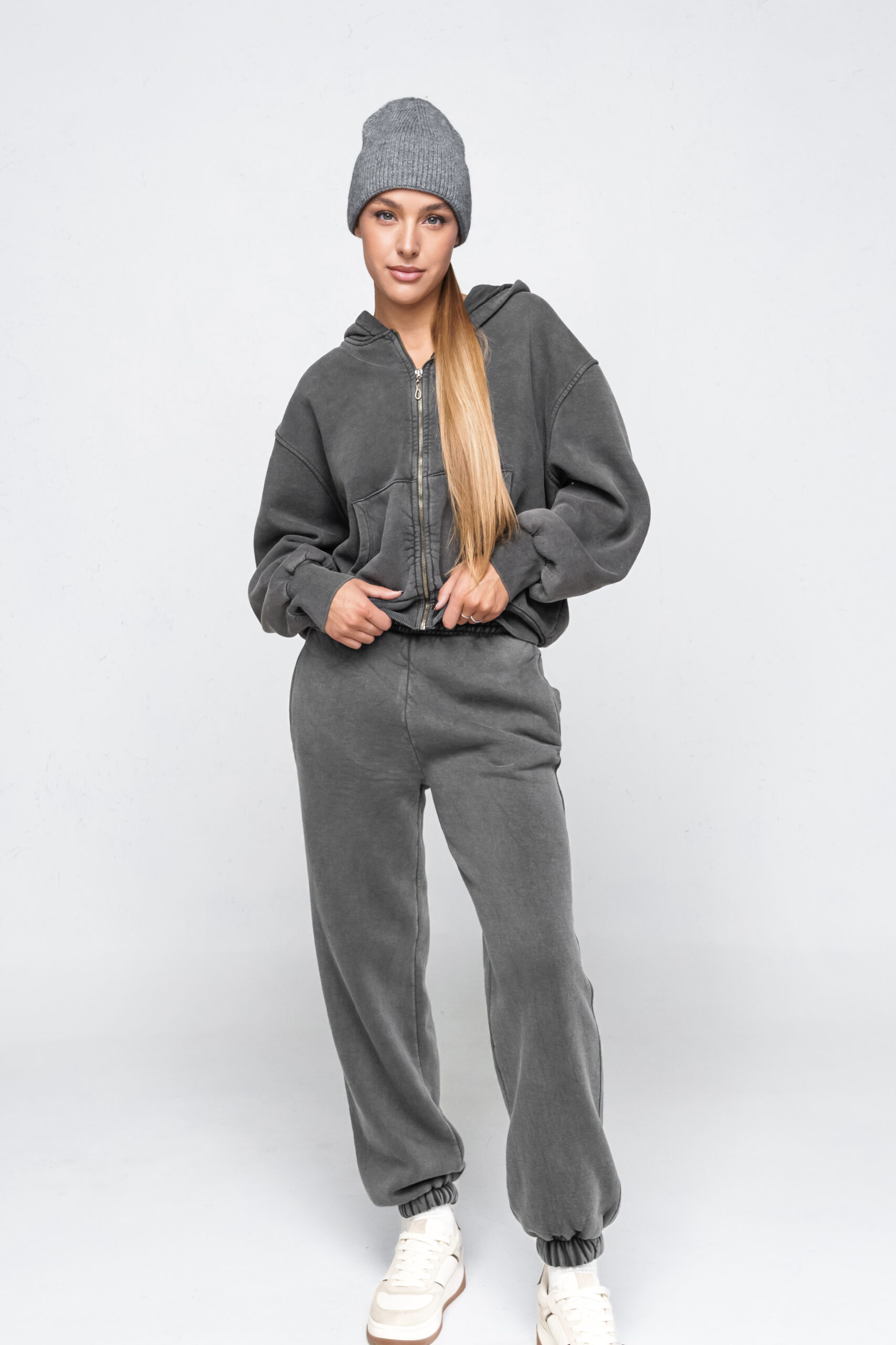 Būkite pirmas aprašęs “Blukintos medvilnės pilkas kostiumėlis su pūkeliu”