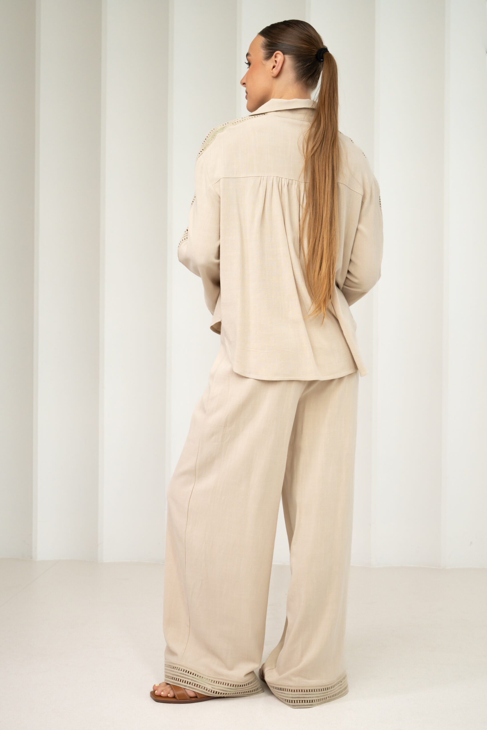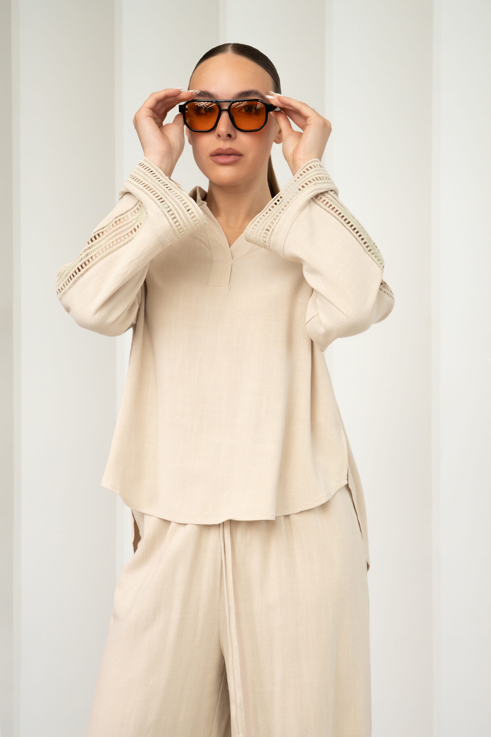 Lengvas, elegantiškas ir itin patogus kostiumėlis šiltam sezonui. Puikus pasirinkimas atostogoms, kelionėms, vakarui prie jūros ar stilingai vasaros dienai mieste. Kostiumėlį sudaro laisvo silueto marškiniai ilgomis rankovėmis ir plačios kelnės. Audinys pagamintas iš 30 % lino ir 70 % viskozės, todėl yra malonus kūnui, lengvai krenta ir atrodo tvarkingai be papildomų pastangų.