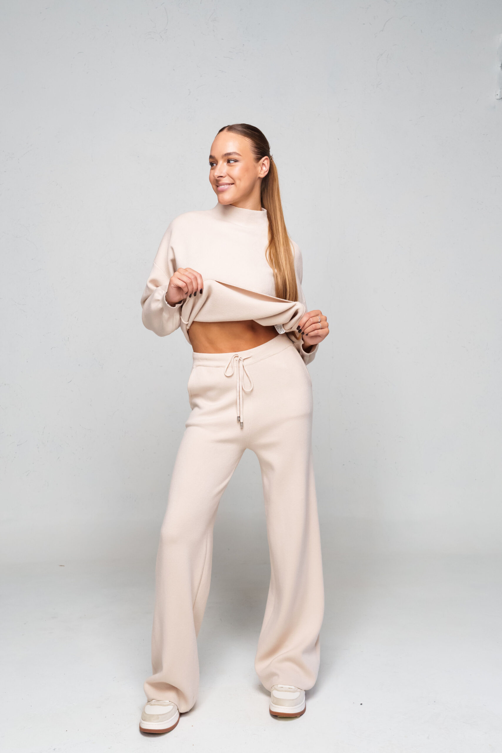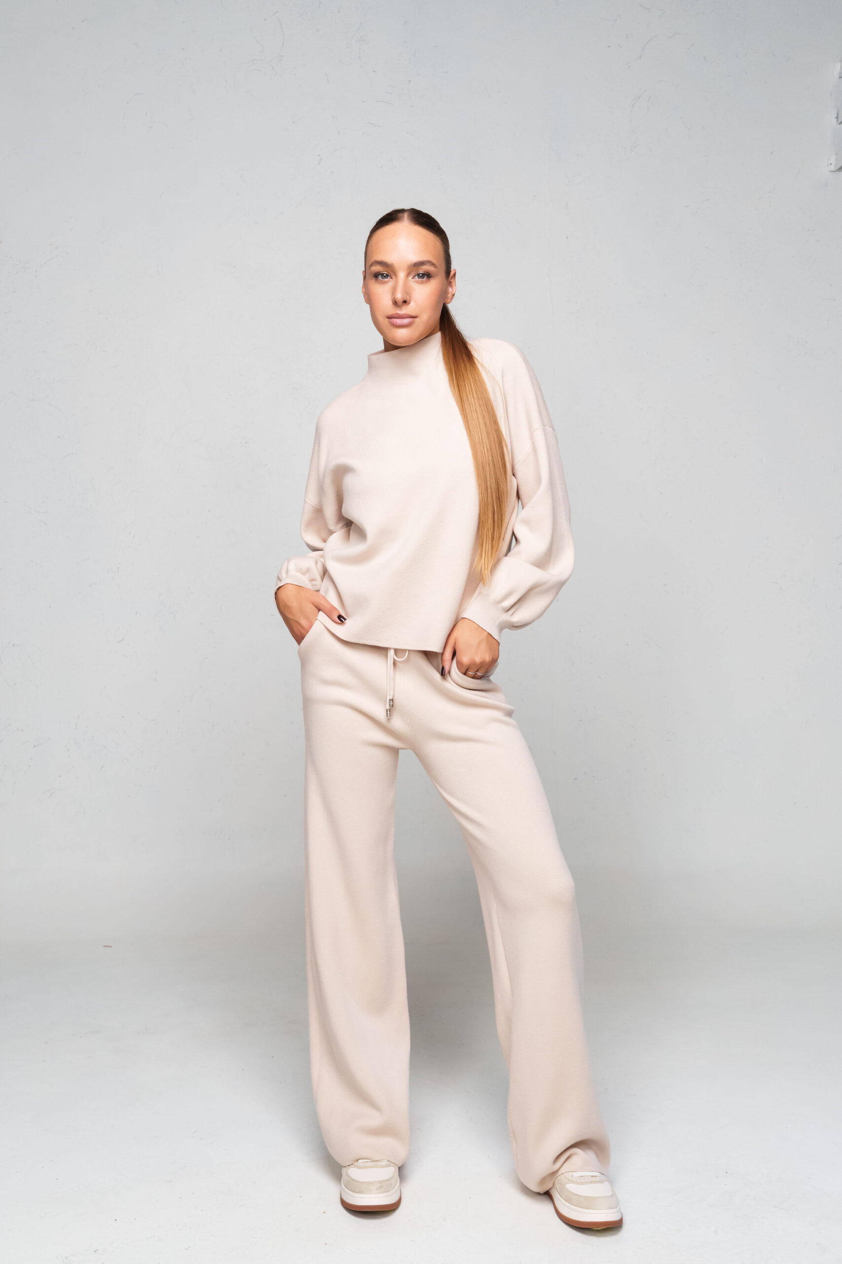 Džemperis su šiek tiek aukštesne, švelniai priglundančia apykakle, kuri subtiliai pabrėžia kaklo zoną ir suteikia minimalistinio elegantiškumo. Kelnės su raišteliais liemens srityje, todėl patogiai prisitaiko prie figūros. Spalva- smėlio.