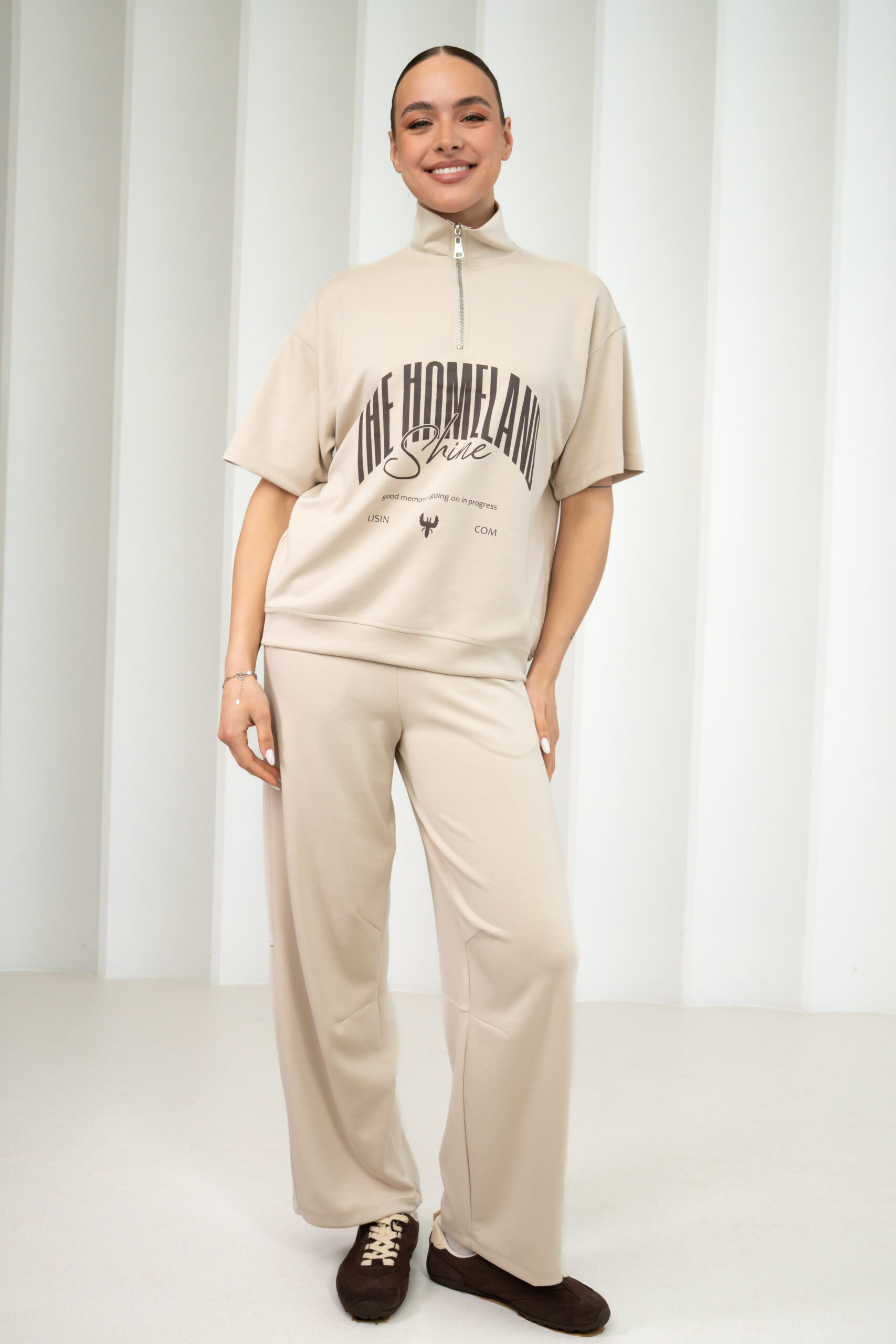Minkštas, patogus ir stilingas laisvalaikio kostiumėlis kasdienai. Komplektą sudaro laisvo silueto palaidinė trumpomis rankovėmis su aukštu kaklu ir užtrauktuku bei plačios, patogios kelnės.