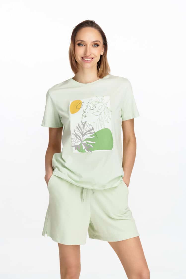 Moteriški marškinėliai su meniniu printu švelnios pistacijų spalvos